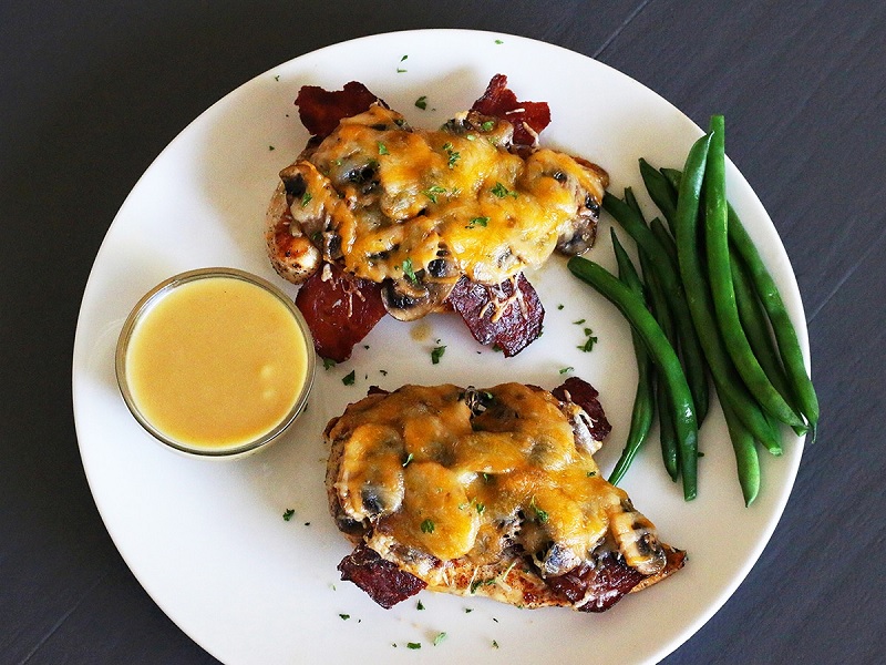 The addition of melted cheeses and smoky bacon takes Alice Springs Chicken to another level of flavor complexity. The cheeses melt perfectly over the chicken, adding a creamy, slightly salty layer that enhances the savory base. Meanwhile, the bacon contributes a smoky, crispy element that contrasts beautifully with the softness of the chicken and sauce.